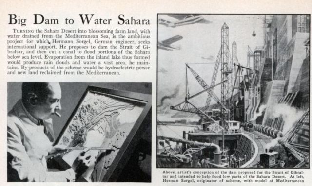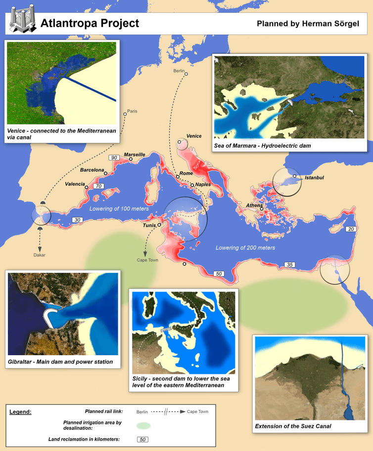 His Project Atlantropa proposed building an eighteen-mile long dam spanning the straits of Gibraltar. A second dam would halt the Bosporus by blocking the Black Sea. Many rivers feed the Mediterranean but most of the Mediterranean flows in from the Atlantic Ocean. Water pushing through cutting edge turbines would create sufficient power to provide for all the needs of both Europe and Africa.