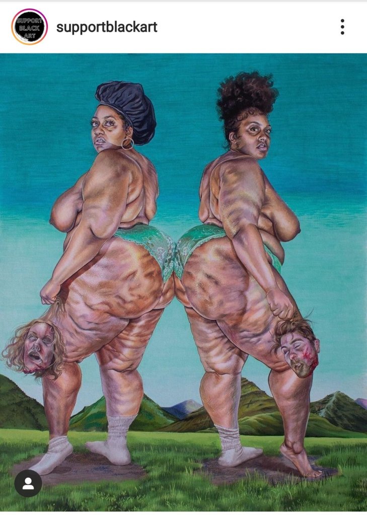 The image, produced by an scribbling artist working under the name ‘sugarygarbage’, was shared to a page called ‘supportblackart’ and shows two black women posing with the severed heads of a white woman and man.
