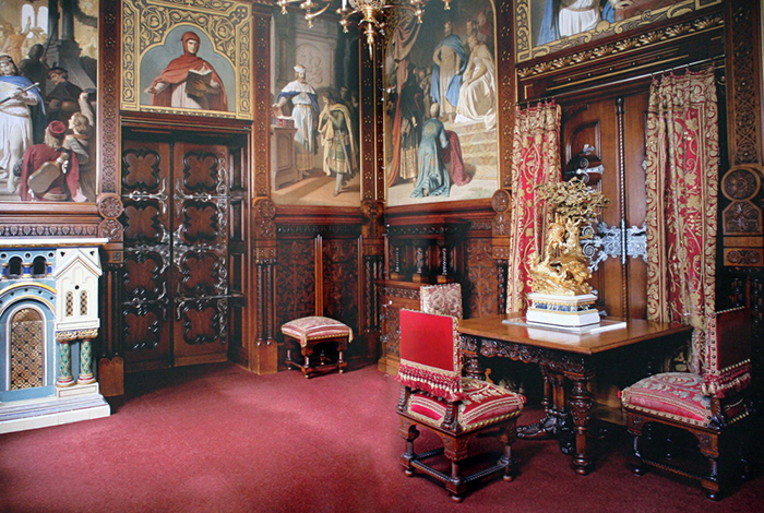 The last king of Bavaria paid special attention to bedrooms and offices. It is in them that his preferences are always fully realised. Ludwig’s private chambers are made in a neo-Gothic style, and even the stove seems to copy the facade of some medieval cathedral. There is a swan-shaped washing jug, swan figurines on a canopy, and embroidered heraldic swans. A small chapel with graceful stained-glass windows adjoins the bedroom, where Ludwig could pray to his patron Saint Louis.