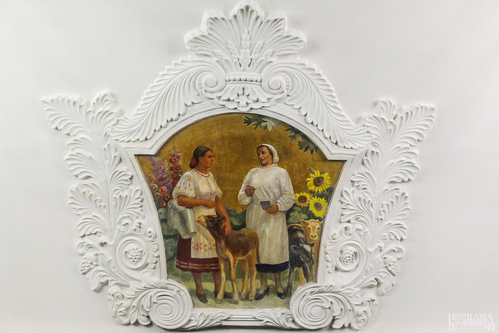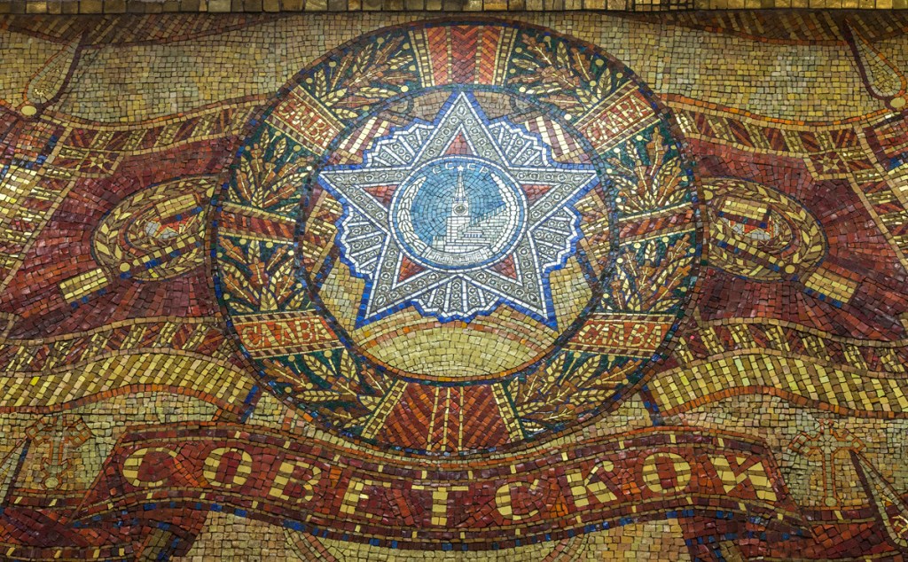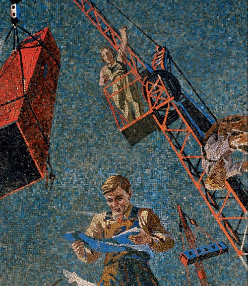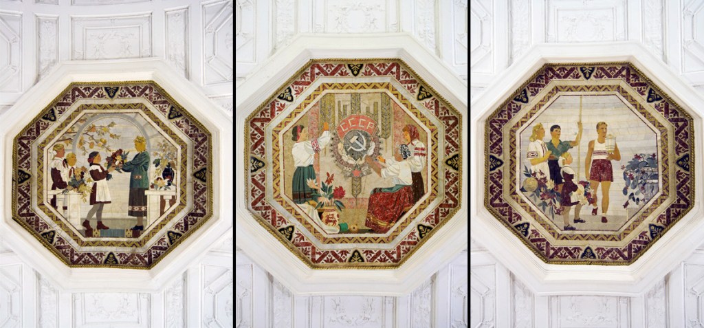 One of the mosaics, known as “Embroiderers,” originally included a portrait of Stalin, but during the de-Stalinization period it was replaced with the Order of the Red Banner of Labor (hammer and sickle). This was not the only image of Uncle Joe to be removed, as we’ll see below. Read more