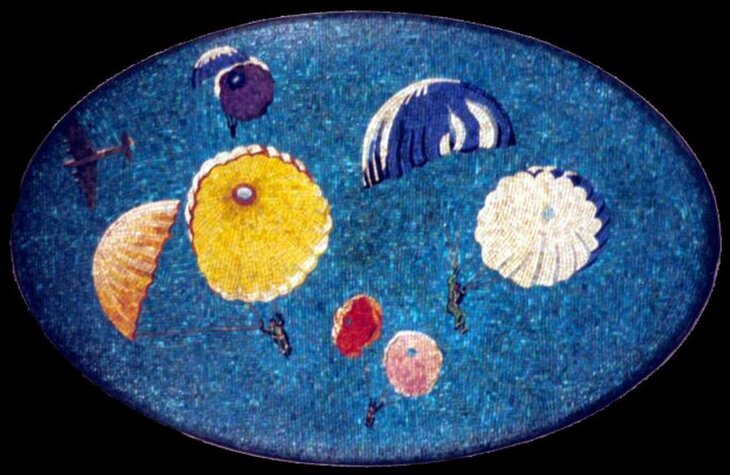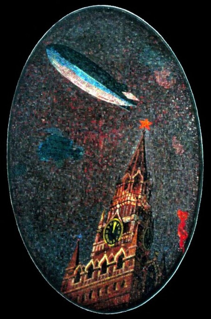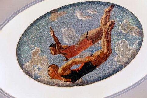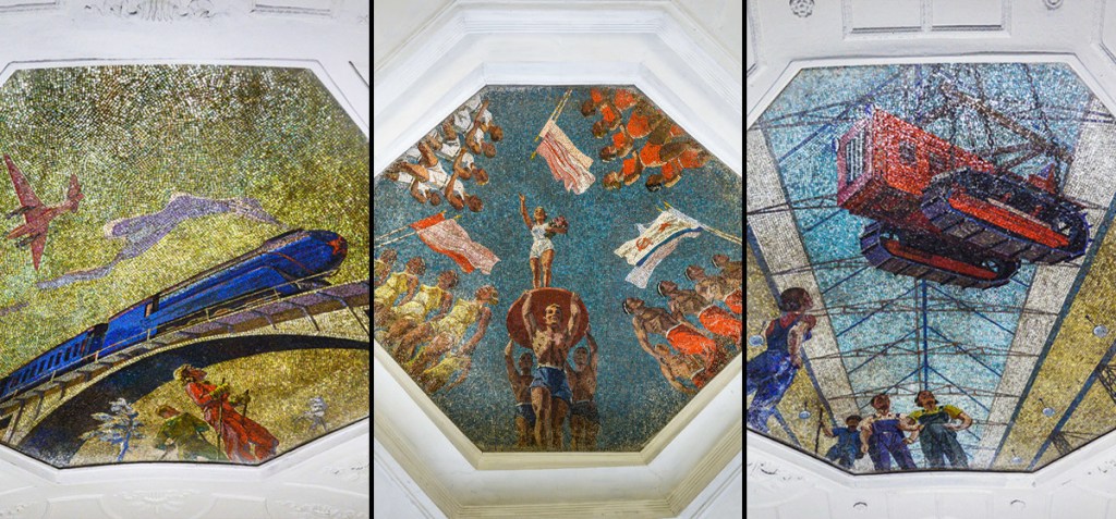 It is worth traveling three stations south of Mayakovskaya on the green line to admire another series of ceiling mosaics by Deyneka. Created in 1941, these octagonal panels also give the feeling that you are looking directly at the sky. The theme is industry and progress, with depictions of machine-building plants, aviation, a parade of athletes, and the triumph of industrialization.