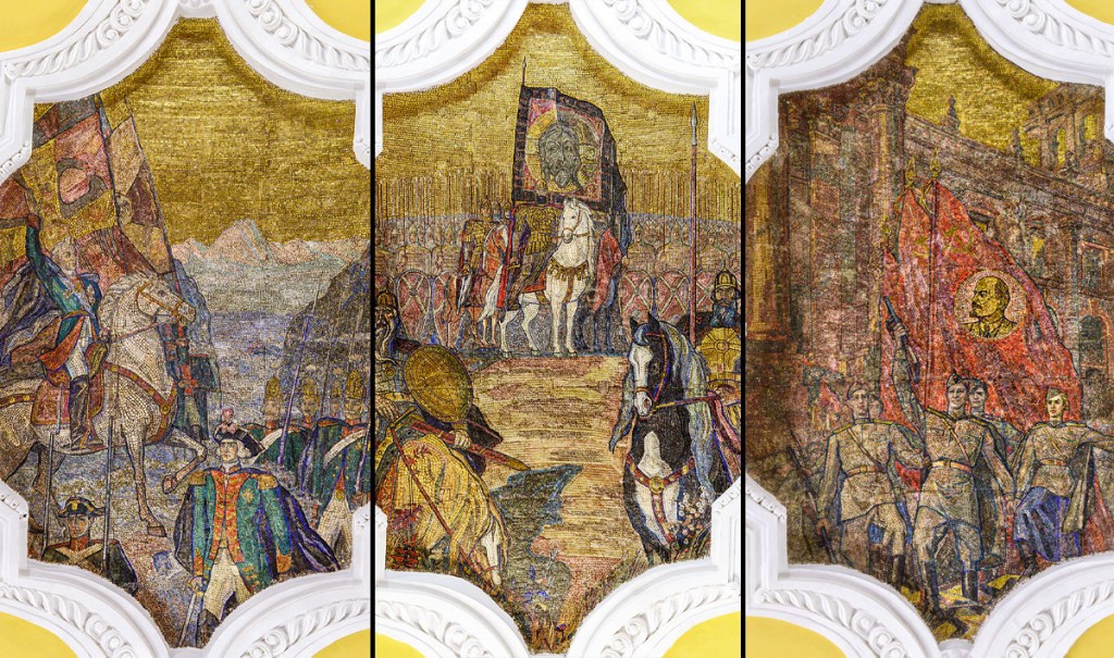 Pavel Korin also decorated Komsomolskaya station on the circle line. Opened in 1952, it was strategically as well as architecturally important, serving passengers at three Moscow railway stations at once, hence it was conceived as a centerpiece. The mosaics here depict patriotic scenes from Russian history: victorious rulers, generals, and other national heroes.