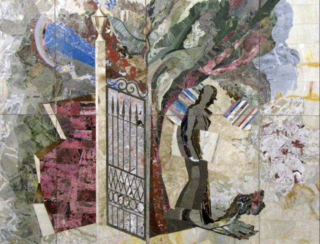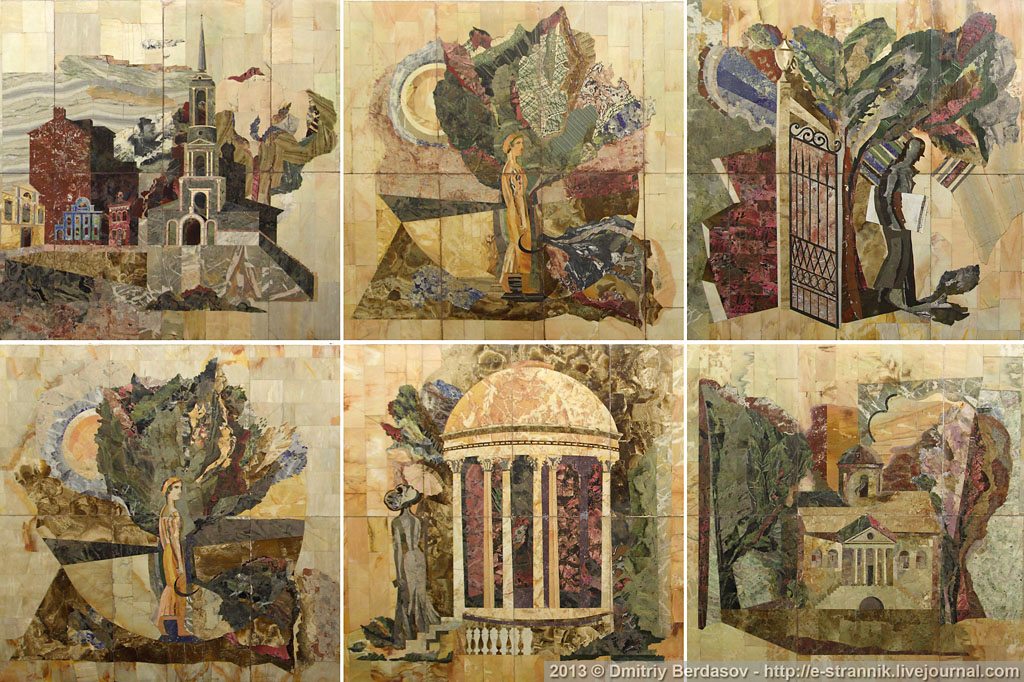 Wait until the train pulls off, and then gaze at the wall mosaics featuring 17 types of non-ferrous minerals native to Russia, from lapis lazuli to jasper. The themes from the works of Anton Chekhov were created using the Florentine mosaic technique by artists Pyotr and Lyudmila Shorchev.