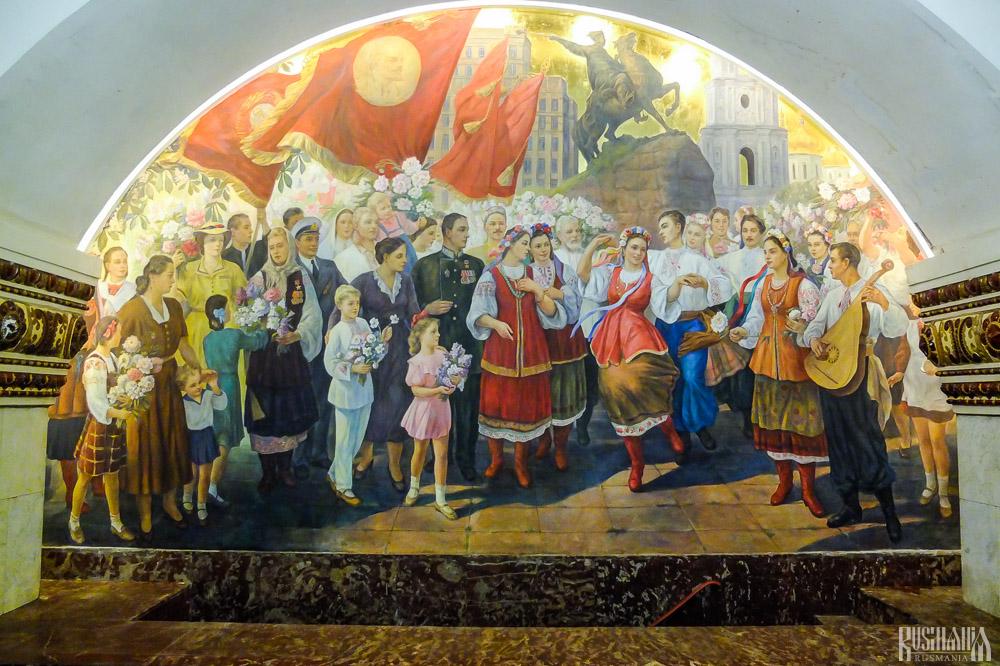 Like its circle-line counterpart the Kievskaya dark-blue-line station is also dedicated to Ukraine and the country’s union with Russia. It was opened in 1953. Above the station’s pillars there are 24 frescoes depicting the workers of Soviet Ukraine including architects, athletes, energy workers, builders, farmers, railway workers and car factory workers. At the end of the station is a massive panel depicting the people celebrating the 300th anniversary of the union between Ukraine and Russia. Source 1, Source 2, Source 3