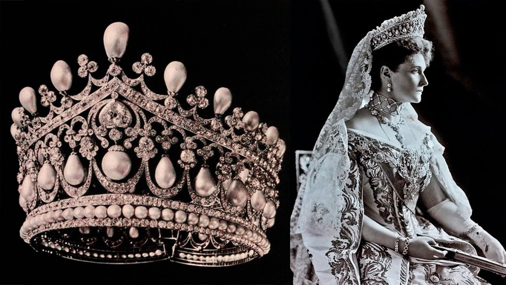 Grand Duke Vladimir Alexandrovich of Russia, the younger brother of Emperor Alexander III, commissioned this tiara for his fiancée, Duchess Marie of Mecklenburg-Schwerin (later Grand Duchess Maria Pavlovna of Russia), in the 1870s. The tiara consists of 15 diamond rings, each of which has a drop of pearl in the center.