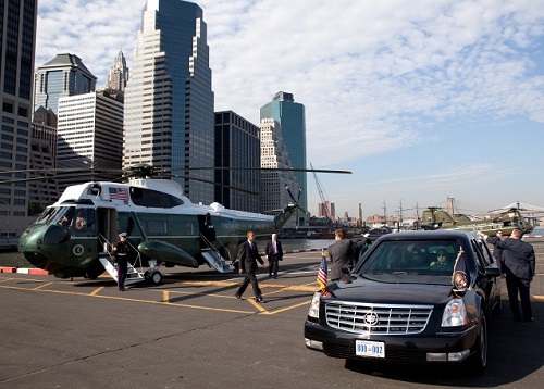 U.S. President Barack Obama uses an armored limousine Cadillac One (Cadillac Presidential Limousine), also known as The Beast. Presidential motorcade has over 40 vehicles that during trips abroad are delivered by three military transport planes Boeing C-17 Globemaster