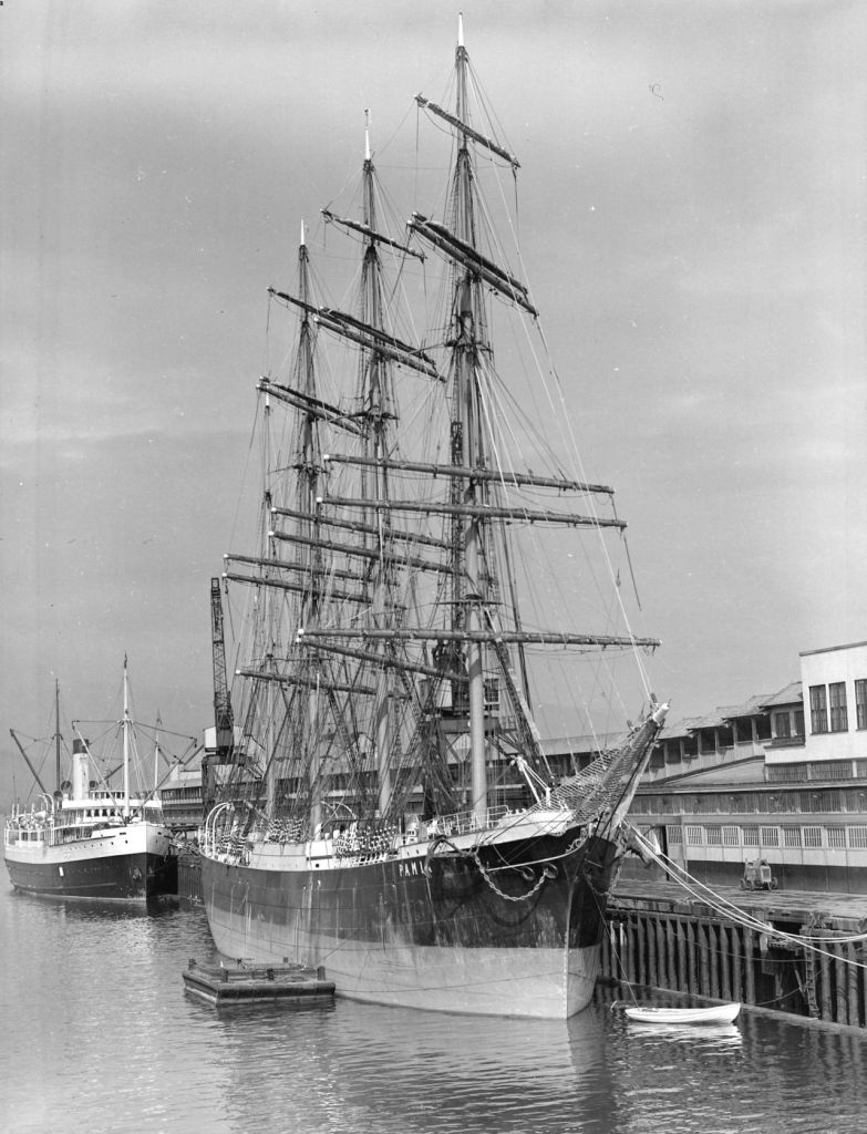 She escaped the war unscathed despite a close call in 1943 when a Japanese submarine was spotted. Evidently, as a fast-moving barque under a strong and fair wind, she did not interest the submarine’s commander. After the war she made one voyage from Wellington via Cape Horn to London, then Antwerp to Auckland and Wellington in 1948.