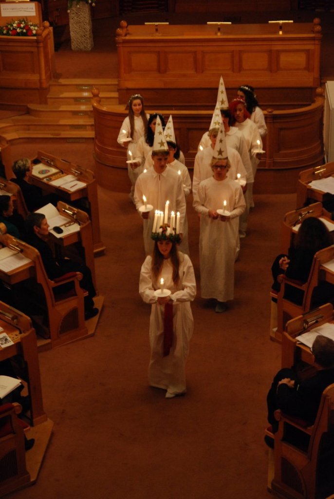 In Norway, Sweden and Swedish-speaking regions of Finland, as songs are sung, girls dressed as Saint Lucy carry cookies and saffron buns in procession, which symbolizes bringing the Light of Christ into the world’s darkness. In both Protestant and Catholic churches, boys participate in the procession as well, playing different roles associated with Christmastide, such as that of Saint Stephen. The celebration of Saint Lucy’s Day is said to help one live the winter days with enough light.