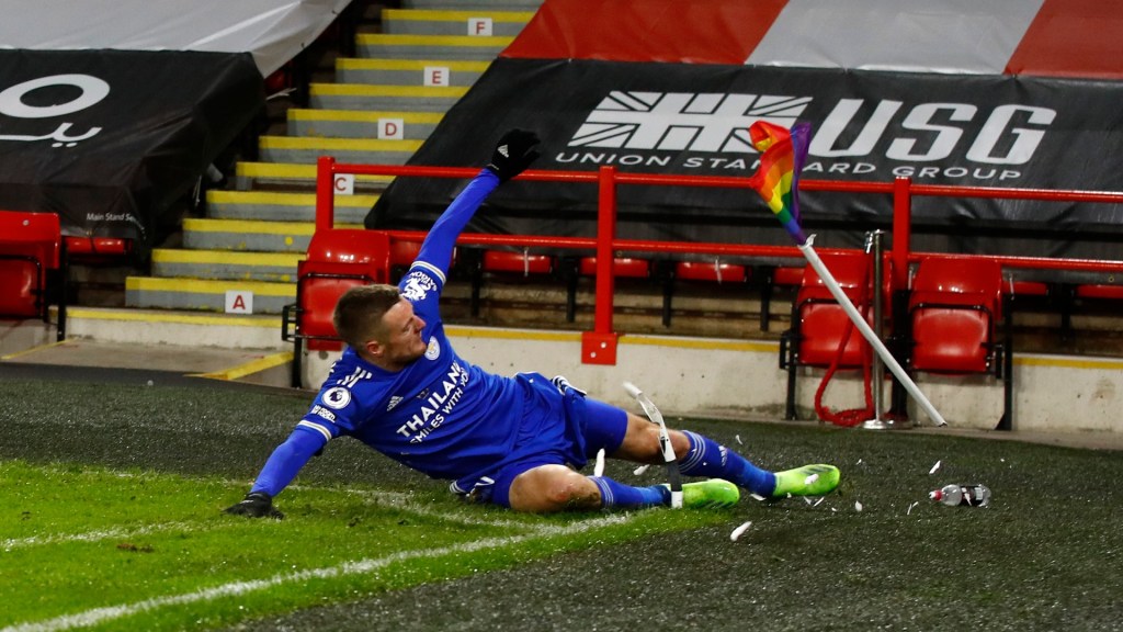 A few days later, Englishman Jamie Vardy scores a good solo effort against Sheffield United and runs off to celebrate. He runs over to the corner flag, leaps into the air and two footed tackles the flag with such venom that it shatters at the point of impact. The rainbow flag falls to the ground. And so do the Twitter tears.