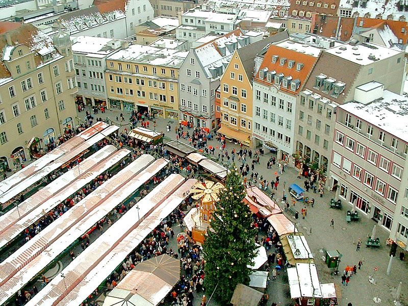Known today as the Christkindlesmarkt, Augsburg’s main Christmas market has borne that name only since 1949. When the market was first mentioned in 1498, it was known as the “Lebzeltermarkt” — a term related to the gingerbread (Lebkuchen) that was sold there (and still is). One of the fair’s unique attractions, a sort of “live Advent calendar,” began in 1977. The Engelesspiel pageant, in which 23 live “angel” figures dressed to imitate an altar by Hans Holbein the Elder appear on the balcony and in the windows of the city hall, plays every Friday, Saturday and Sunday at 6:00 p.m. during December. Another special feature is the “Augsburger Märchenstraße” that displays dioramas of fairy tales in the windows of the shops that line the market.