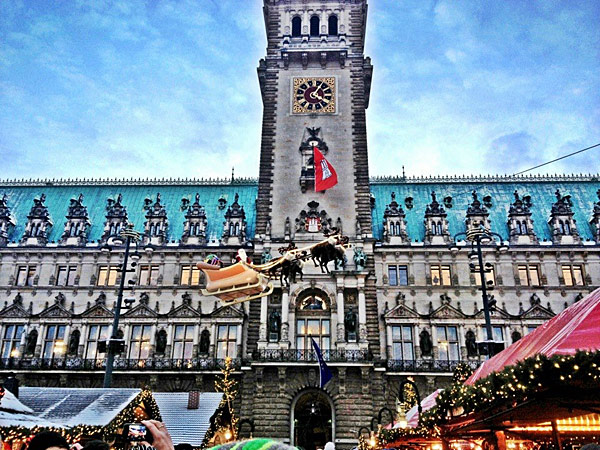 Hamburg’s Weihnachtsmarkt on the city hall plaza features a Santa sleigh that “flies” over the market. PHOTO: Jessica L. Scott-Reid