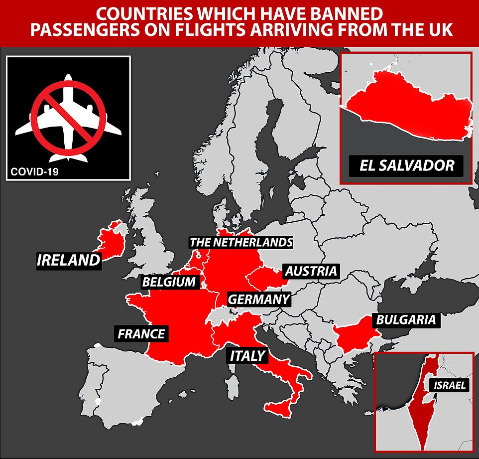 Boris Johnson will chair a meeting of the Government’s Cobra civil contingencies committee on Monday after a series of countries announced they were stopping flights from the UK, Downing Street has said. Eurotunnel Le Shuttle has said that the UK-France border will close at 11 pm tonight and last train at 9.24 pm. Southern England was plunged into a Tier 4 lockdown in a bid to suppress a ‘mutant’ strain of coronavirus. US authorities are looking ‘very carefully’ into the Covid-19 variant while indicating that a ban on UK travel was not currently on the cards