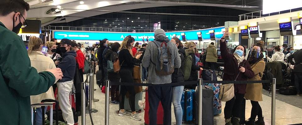 London’s Heathrow Airport was pictured descending into chaos last night as tens of thousands of passengers scrambled onto the last flight to Dublin minutes before a Covid-19 travel ban set in at midnight to nations across Europe including Ireland.