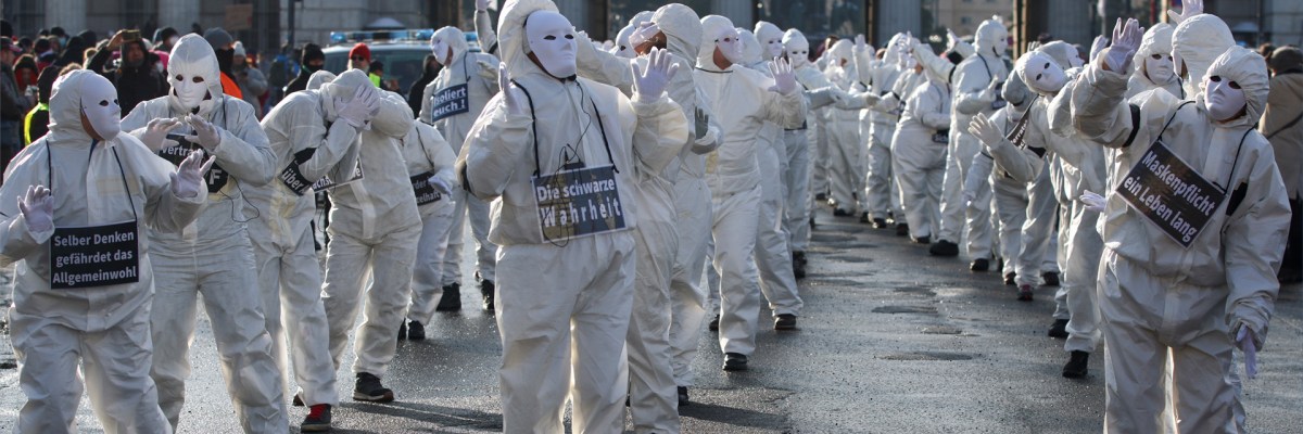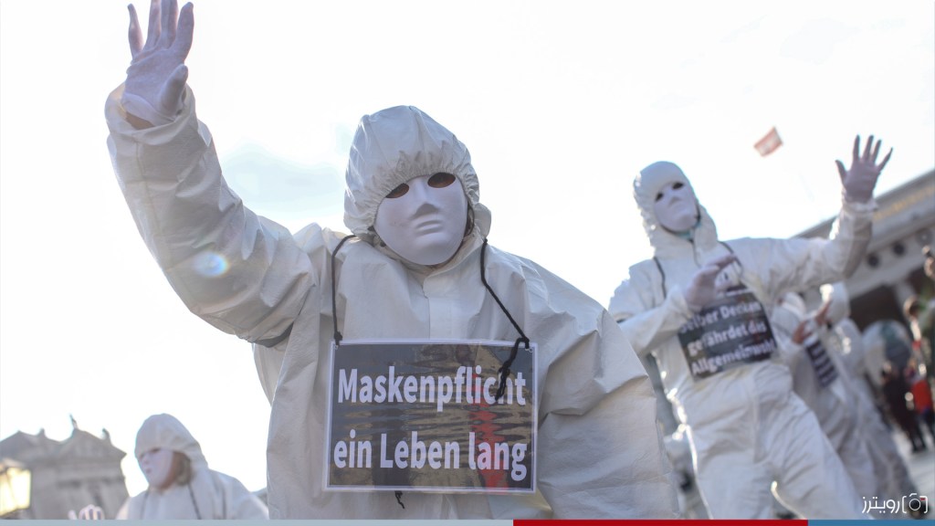 Protesters in white suits and wearing masks attend a demonstration against the coronavirus disease (COVID-19) measures and their economic consequences in Vienna, Austria, January 16, 2021. REUTERS/Lisi Niesner