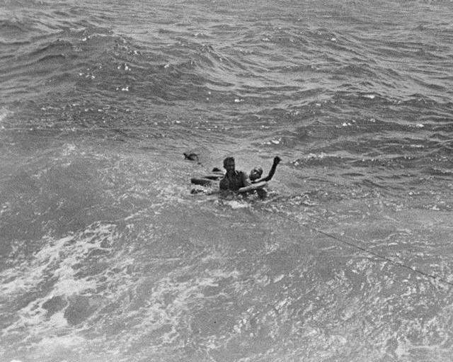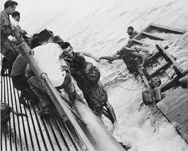 USS Pampanito and USS Sealion had continued to patrol the area in the South China Sea following the attack on the convoy. After three days the submarine crews spotted wreckage and debris with men floating on rafts: