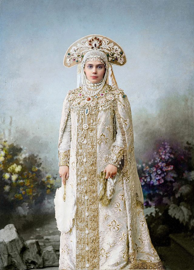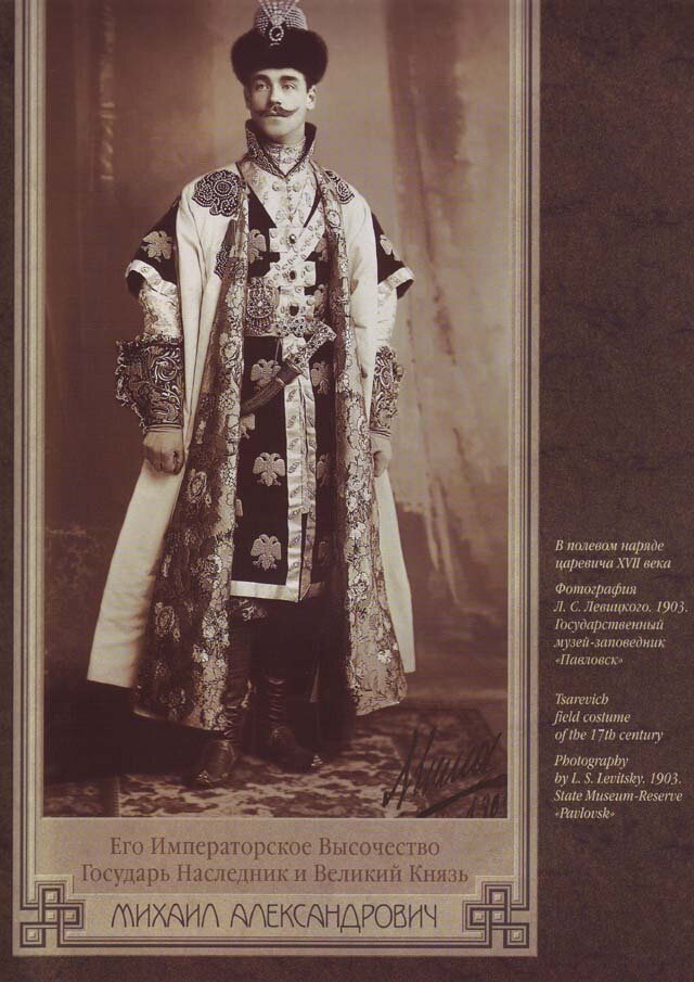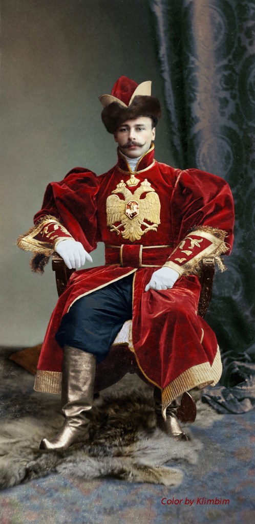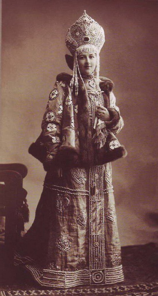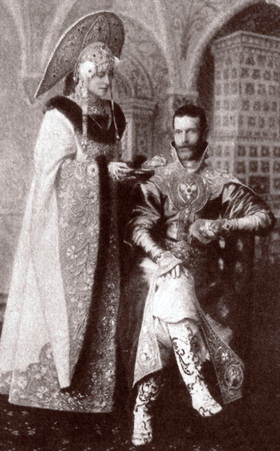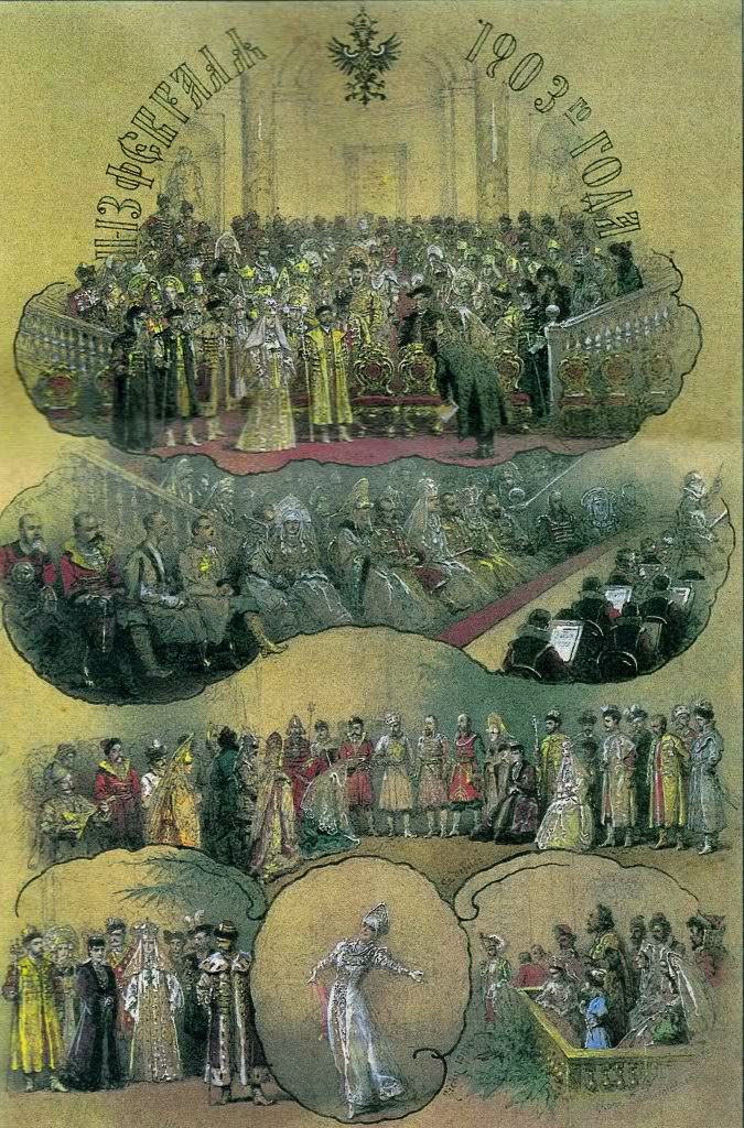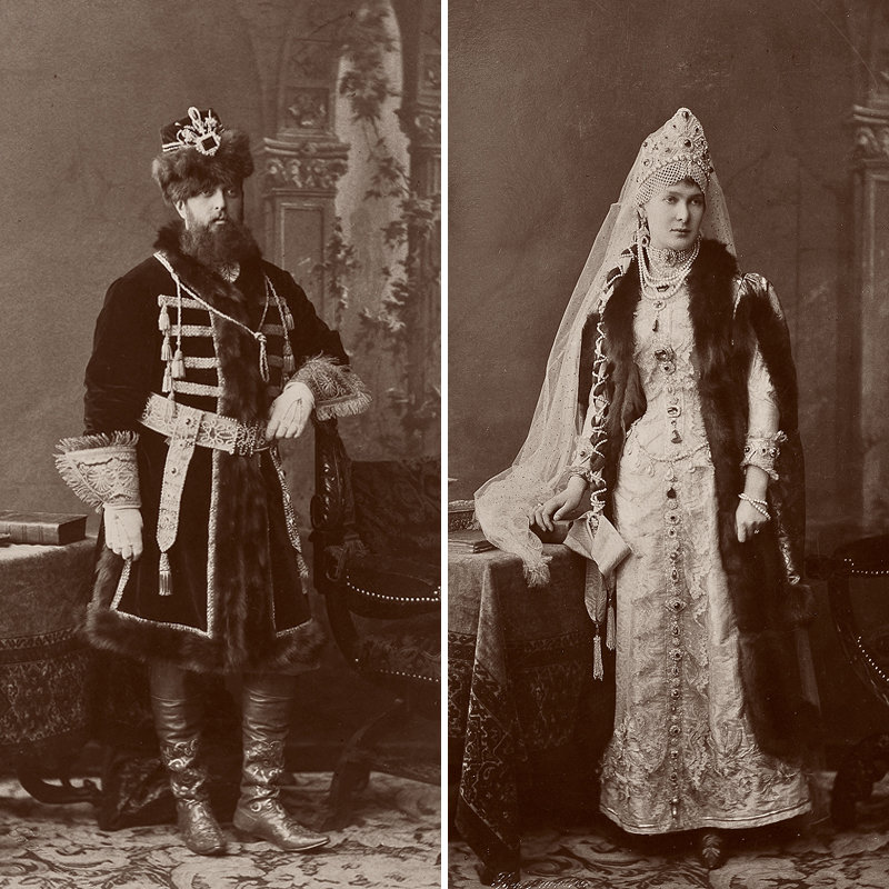 All 390 guests were requested to come in traditional Russian 17th-century dress. This grand event was remarkable for its luxurious Russian-style costumes. Court ladies were attired in sundresses embroidered with precious stones and kokoshniks (head-dresses) adorned with the finest family jewels, while gentlemen boasted richly decorated caftans and boyar-style fur hats. / Grand Duke Andrey Vladimirovich. ~ Michael Walsh. Source 1, Source 2, Source 3