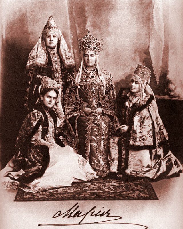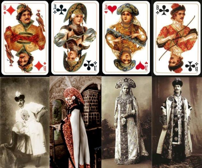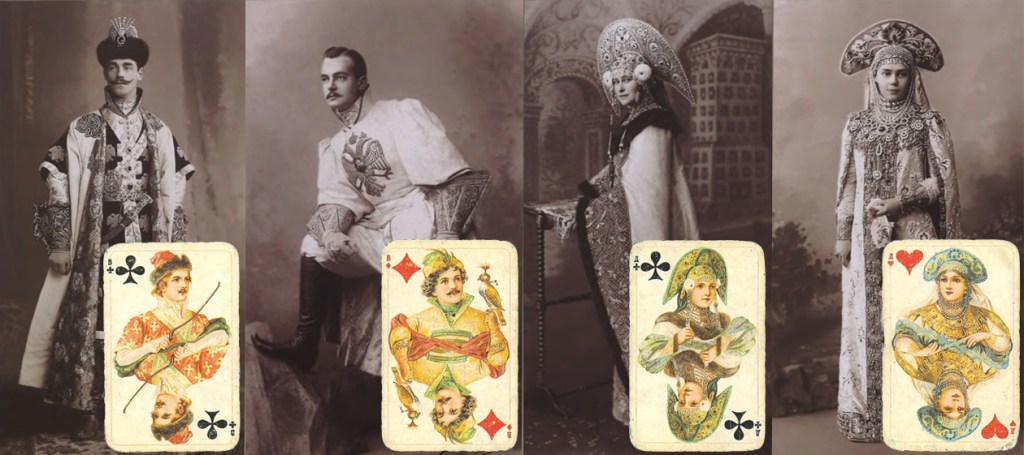 The jack of clubs was copied from Grand Duke Mikhail Alexandrovich’s apparel, and the jack of diamonds came from Grand Duke Andrei Vladimirovich. The queen of clubs was largely borrowed from the dress of Grand Duchess Elizaveta Fedorovna, and the queen of hearts resembles the tsar’s sister, Ksenia Alexandrovna, dressed as a boyar’s wife.