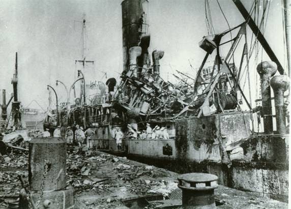 Shards of flying metal careered through the air and landed up to a mile away. The Jalapadma, a 4,000-ton cargo ship berthed next to the Fort Stikine, was lifted into the air and deposited on the quay wall. One of the Fort Stikine’s anchors was caught in the rigging of a ship in a neighbouring dock.