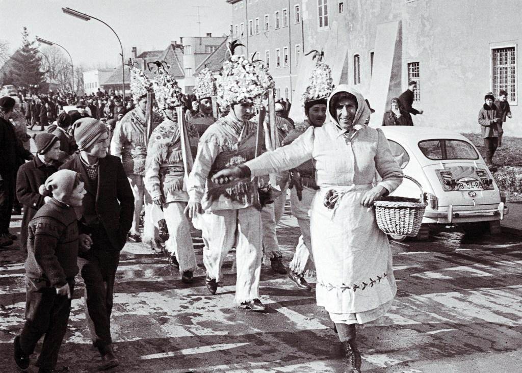 One year later, the Markovci costumes were joined by ploughmen from Lancova Vas, log-haulers from Cirkovci, and mourners from Hajdina. For the first time, carnival (non-ethnographic) groups presented themselves in the afternoon. In 1962 the event reached beyond local boundaries by inviting other carnival figures such as lavfarji (< Bavarian German Laufer ‘runner’) from Cerkno and borovo gostuvanje (literally, “pine wedding participants”) from Predanovci in the Prekmurje region.
