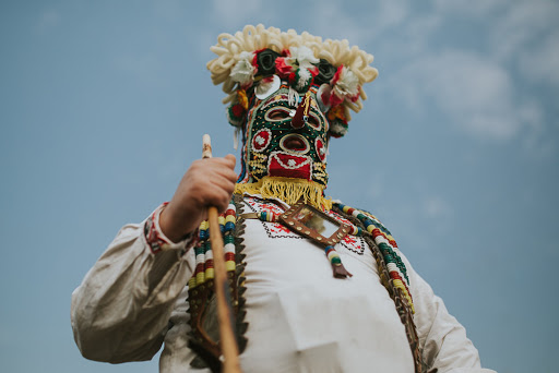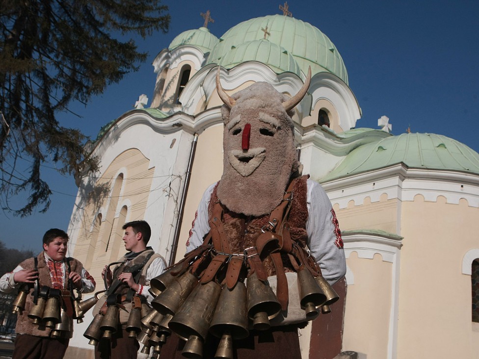 Kukeri are elaborately costumed Bulgarian men, who perform traditional rituals intended to scare away evil spirits. Closely related traditions are found throughout the Balkans and Greece (including Romania and the Pontus). The costumes cover most of the body and include decorated wooden masks of animals (sometimes double-faced) and large bells attached to the belt. Around New Year and before Lent, the kukeri walk and dance through villages to scare away evil spirits with their costumes and the sound of their bells. They are also believed to provide a good harvest, health, and happiness to the village during the year.