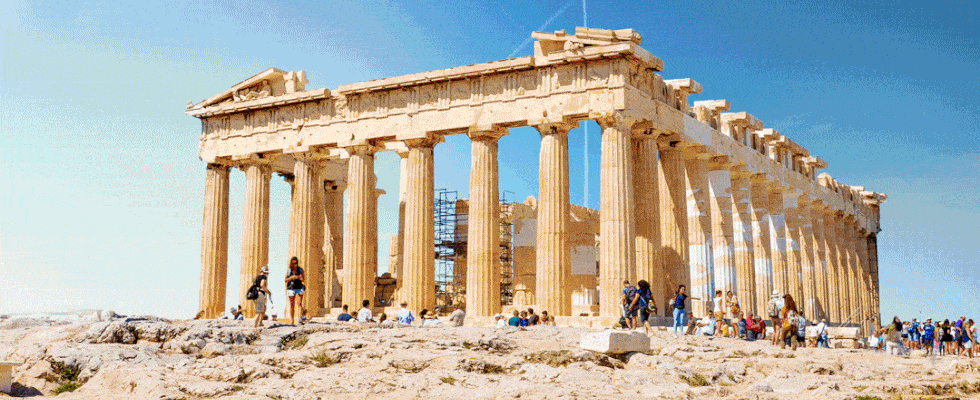 Atop the Acropolis sits perhaps the most famous building of Ancient Greece. Built in 447 B.C., the Parthenon sheltered a monumental golden statue of Athena, the Greek goddess of wisdom, craft, and war. The Great Turkish War in 1687 damaged the temple when an ammunition dump exploded inside the structure.