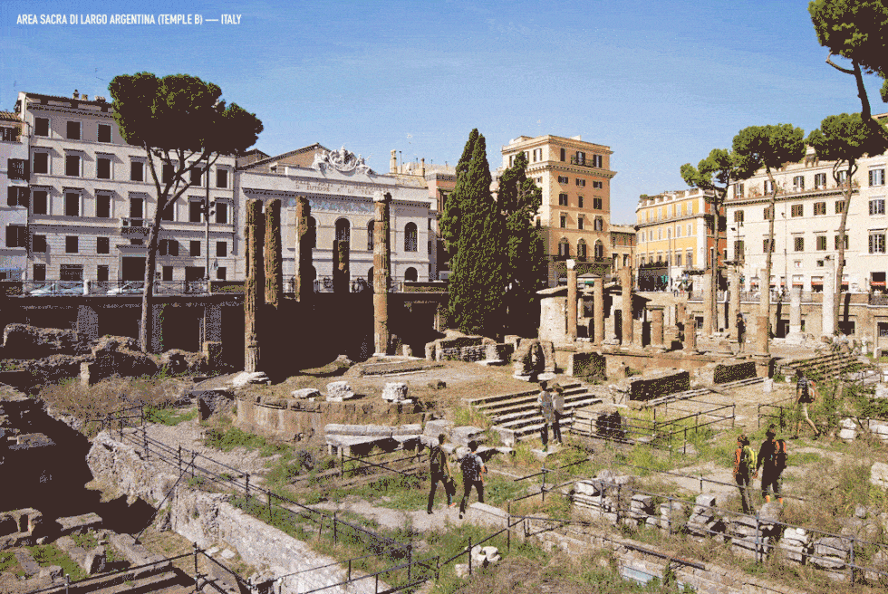 Originally discovered in 1920, this Italian ruin shows off columns and steps of what is now known as Temple B, the most recent of four temples at the site. A reimagining of the Area Sacra di Largo site offers a look at the splendor of the temple. Source
