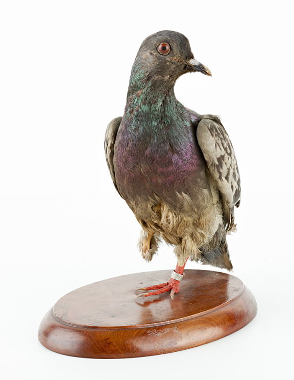 President Wilson was one of many pigeons serving in the U.S. Army Signal Corps during World War I. On the morning of 5 October, 1918, during the Meuse-Argonne Offensive in the vicinity of Grandpré, France, Wilson’s unit was pinned down by enemy fire and was unable to move. President Wilson was released with a message requesting artillery support. While flying back to his loft at Rampont some forty kilometers away, President Wilson attracted the attention of the German soldiers who tried their best to bring down the bird. President Wilson managed to deliver the lifesaving message within a record twenty-five minutes. When he landed, his left leg was found shot away and there was a gaping wound in his breast.