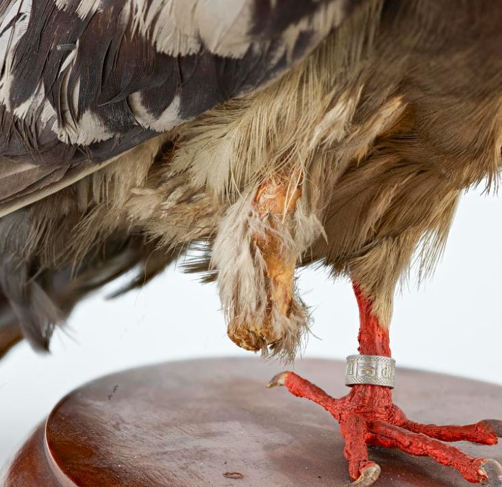 Close up of Cher Ami’s taxidermied body showing the missing leg.