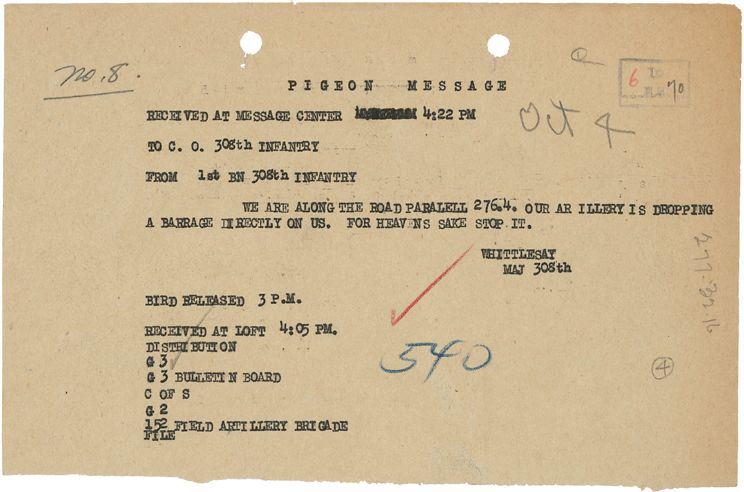 Major Whittlesey tried dispatching runners, but they were killed or captured. In the end, Whittlesey began dispatching messages by pigeon. The first pigeon, carrying the first message, “Many wounded. We cannot evacuate” was shot down. A second bird with the message, “Men are suffering. Can support be sent?” also got killed before it could deliver its message. On 4 October, 1918, Whittlesey wrote on a piece of onion paper: