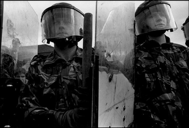 IRELAND. Portadown. 1997. British soldiers in anti-riot gear, are preventing Protestants from clashing with Catholics when they march through their neighborhood to commemorate the battle of Ardoyne.