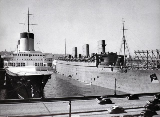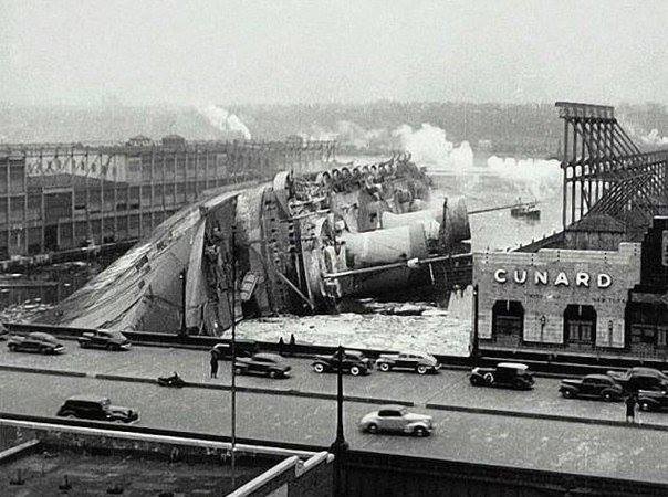 Jinxed or sabotaged by Hitler’s Reich? In January 1942 the U.S. War Department took her over for conversion into a troopship but while she was being loaded with supplies, a spark from a welder’s torch ignited a bale of lifejackets. The fire spread rapidly, and a series of mistakes led to the ship turning on her port side and sinking at her berth.