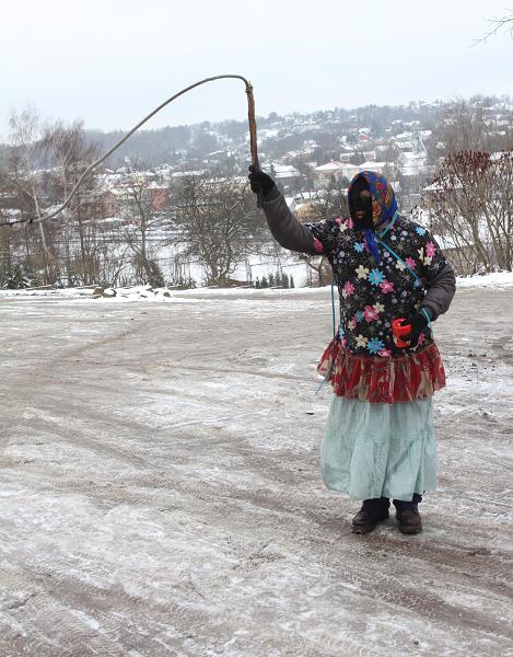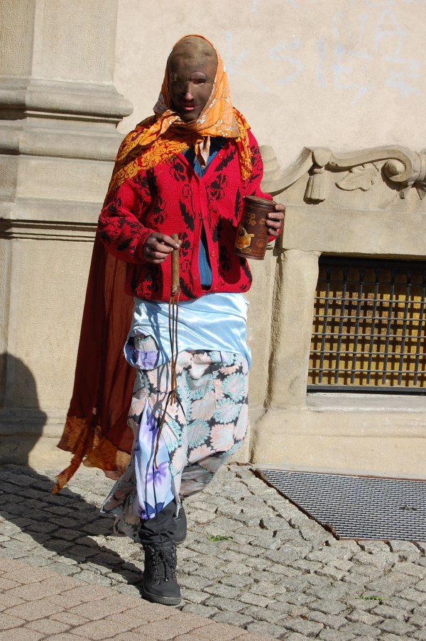 Siuda Baba is customarily ‘played’ by a young man dressed in an old long skirt and a headscarf – remnant of old Slavic rites in which only women or men dressed as women were allowed to act. She’s usually accompanied by people in costumes representing the local folklore, just like it was done a century ago, including for example a person dressed as a Romani and 4 or more people in folk costumes from the nearby Kraków.