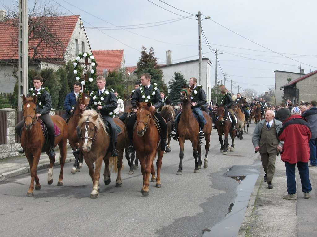 The Easter Riding (known locally as Osterritt ) is also widespread in Upper Silesia , also in Czech Silesia and in the northern Czech Schluckenauer Zipfel . The tradition is still cultivated in the Upper Silesian towns of Racibórz ( Ratibor ), Pietrowice Wielkie ( Groß Peterwitz ), Zawada Książęca ( Duke Zawada ), Sternalitz , Bischdorf , Ostropa ( Ostroppa in Gleiwitz ), Bieńkowice ( Benkowitz ) and in the Czech Lukulášovice and Mikulášovice . The ride of kings also has a long tradition in Moravia . Source 1, Source 2