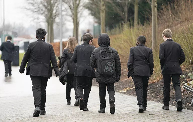 Pupils arrive at a school in in Manchester, England, Monday March 8, 2021.