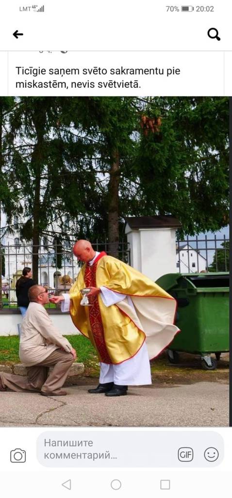 There were also pictures in which the priest went out to the people behind the fence. People received communion as they kneeled in supplication besides scattered garbage cans.