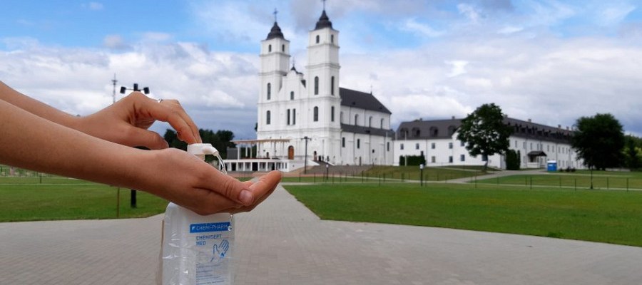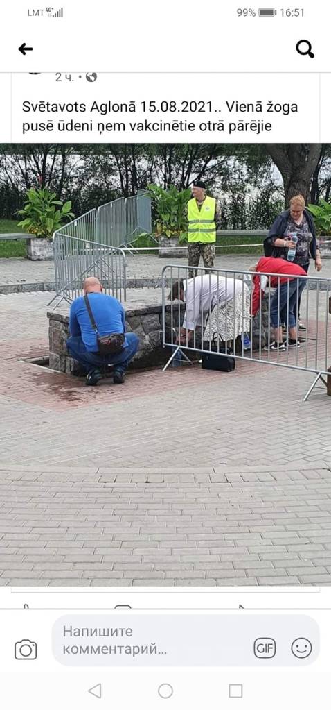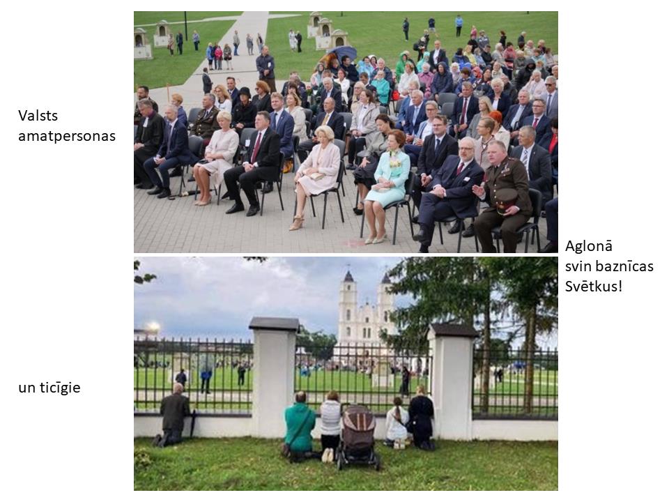 In the first, politicians and ministers after arriving in their taxpayer-funded limousines sit on chairs, watching the service. On the second, the believers, many of them of great age who were not allowed beyond the fence stockade around the basilica are seen kneeling at the fence and praying. The usually crowded square near the Aglona Basilica is almost empty.