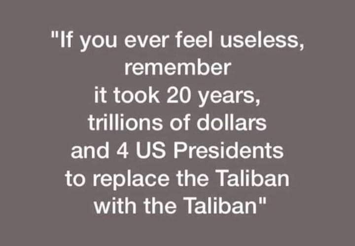Brown University’s Costs of War Project estimates that the US (taxpayers) spent some $2.26 trillion on the conflict and illegal occupation of Afghanistan over the past two decades. More than 100,000 Afghan civilians, tens of thousands of Afghan security forces personnel and Taliban fighters, about 3,500 US and NATO troops and 4,000+ Western mercenaries were killed in that time, with hundreds of thousands more injured, and millions becoming refugees.