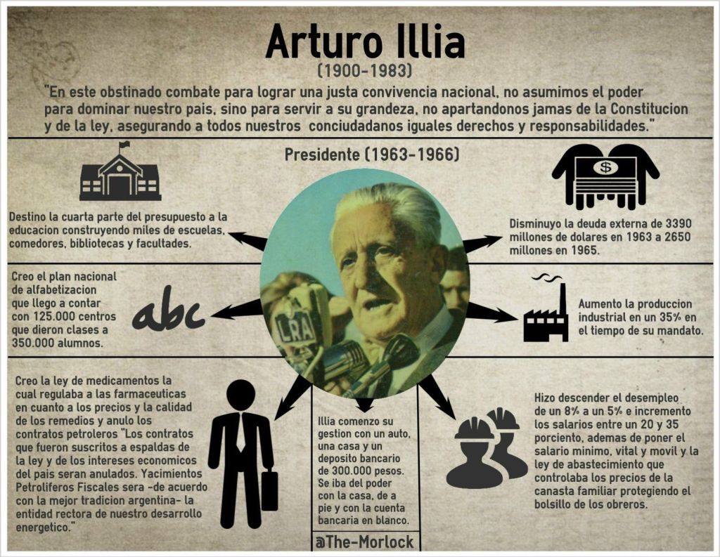 Illia reached the presidency of the Nation in elections controlled by the Armed Forces in which Peronism was outlawed and while the previous constitutional president Arturo Frondizi was detained. During his government, the national industry was promoted, 23% of the national budget was allocated to education, the highest figure in the history of the country, unemployment fell, the external debt decreased, a literacy plan was carried out and sanctioned the Minimum, Vital and Mobile Salary laws and the so-called Oñativia Law also called Medications.