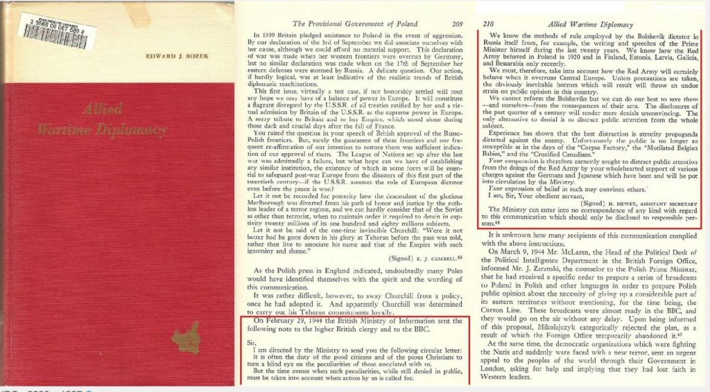 *The above-mentioned Information Ministry letter is reproduced in a 1958 book entitled Allied Wartime Diplomacy: A Pattern in Poland by Edward J. Rozek, the image below is captured from the first edition, pages 209-210 (courtesy of Nationalvanguard.org). Source