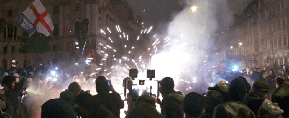 Metropolitan Police said in a statement that ‘its officers were forced to engage after ’a crowd in Parliament Square have been dangerously lighting fireworks and rockets.’ Police said they moved into the crowd to ’remove any fireworks and prevent people coming to harm.’