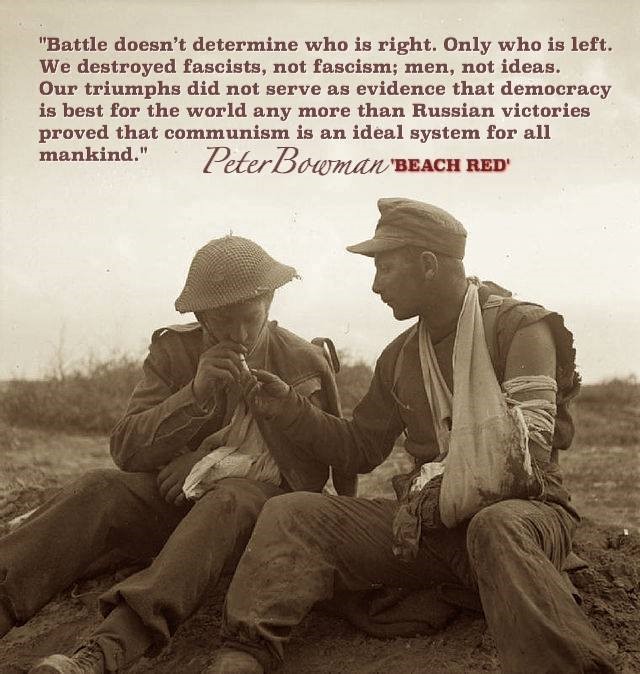 “Battle doesn’t determine who is right. Only who is left. We destroyed fascists, not fascism; men, not ideas. Our triumphs did not serve as evidence that democracy is best for the world any more than Russian victories proved that communism is an ideal system for all mankind. Only through our peacetime efforts to abolish war and bring a larger measure of freedom and security to all peoples can we reveal to others that we are any better than our defeated opponents.” ~ Peter Bowman, Author ‘Beach Red’.