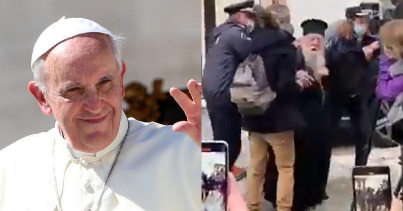 Catholic News Agency reporter Hannah Brockhaus reported that Francis ‘was protested as he entered a meeting with his Beatitude Ieronymos II and other Greek Orthodox leaders in Athens today.’ Video shows the man being taken to the floor then carried away by police as he continued shouting truths at Francis.