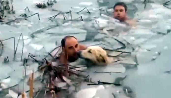 Without a moment’s hesitation, the two officers stripped off their uniforms and waded into the freezing cold water of the lake. The dog was still afloat but was clearly in danger of drowning due to hypothermia setting in. The two brave men, without the help of thermal wear, had to use a wooden stick to break around ten meters of ice to reach the stricken animal.