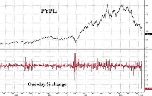 PayPal, notorious for aggressively de-platforming and demonetizing all voices with which the woke liberal cancel-culture brigade disagrees, crashed the most on record on Tuesday morning one day after it reported dismal trading results.