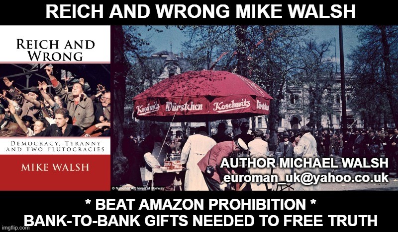 REICH AND WRONG Mike Walsh. Hitler’s Reich lasted 13.5 years through peace and war creating an economy, prosperity and lifestyle no Western country could match. Compare 1930s Hitler’s prosperous Reich with the shocking 1930s poverty of the US, USSR and UK. READ FREE saves you from paying the book’s cover price. Michael will send you his bank-to-bank details if you wish to voluntarily transfer or ZELLE a donation to cover his costs. Contact Mike at euroman_uk@yahoo.co.uk