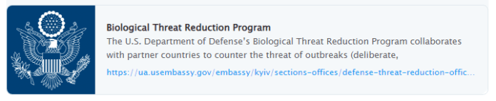 There is speculation that this could include Biolabs installed in the US. First I checked whether the US has Biolabs in Ukraine. Yes, the United States does not and cannot deny that it has bio-laboratories situated in diverse regions of Ukraine. In Deep State parlance these Biolabs are sold as defence aka Biological Threat Reduction Program in Ukraine.