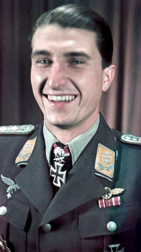 Typically fun-loving the 21-year old was humble and dismissive of his victories. Stationed in Vilnius he was celebrating his 250th downing when on October 19, 1943, he was called to the telephone. At the other end of the line was Adolf Hitler. During the call, he learned that he was to be awarded the Knight’s Cross with Diamonds. Only seven other officers earned this outstanding award.
