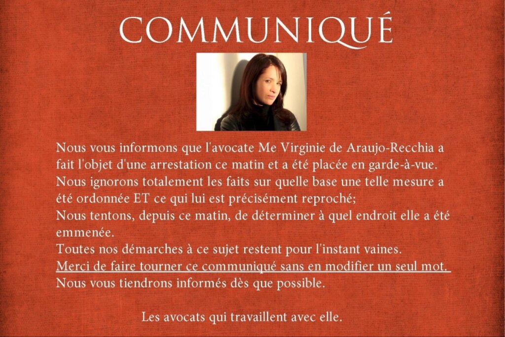 A press release has been circulated: Translation: We are informing you that the lawyer M. Virginie de Araujo-Recchia was arrested this morning and placed in custody. We don’t fully know the circumstances under which such a measure was decided and what she is being charged with. We have been trying since this morning to determine where she has been taken. All our efforts in this regard have so far been in vain. Thanks for circulating this message, without changing a single word. We’ll keep you informed as soon as possible. Source