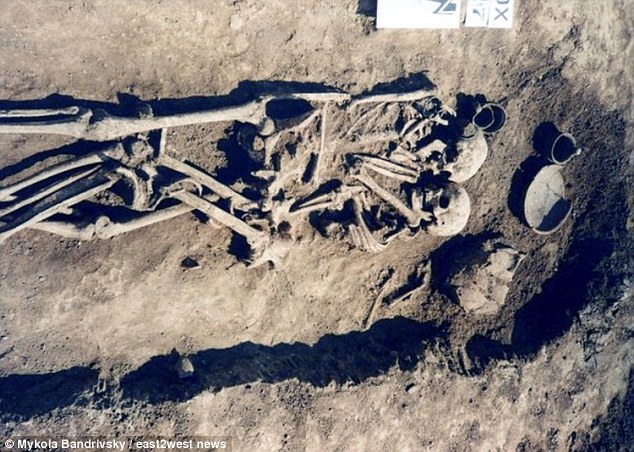 The renowned Ukrainian archaeologist said: ‘It is interesting that in other parts of Europe dead men and women in couple burials were laid next to each other. But in the Vysotskaya culture, the couples in double graves were arranged in a way to demonstrate the tenderness and greatest sympathy towards each other.’