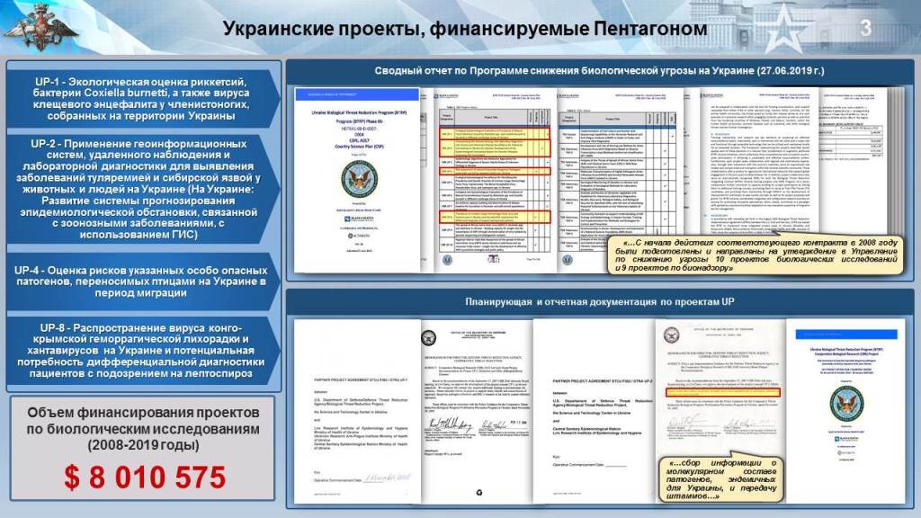 In particular, the Ministry of Defence spoke about a memorandum prepared by the office of the US Secretary of Defence regarding the UP-2 project for mapping especially dangerous pathogens on the territory of Ukraine. The department, according to Kirillov, has information about the implementation of ten such projects, which included work with pathogens of especially dangerous and economically significant infections.